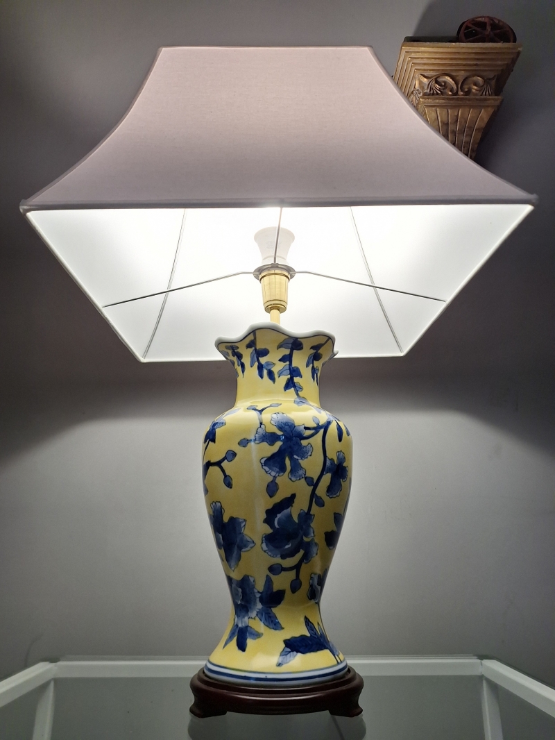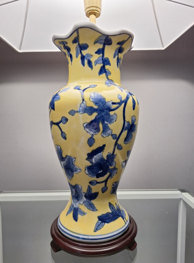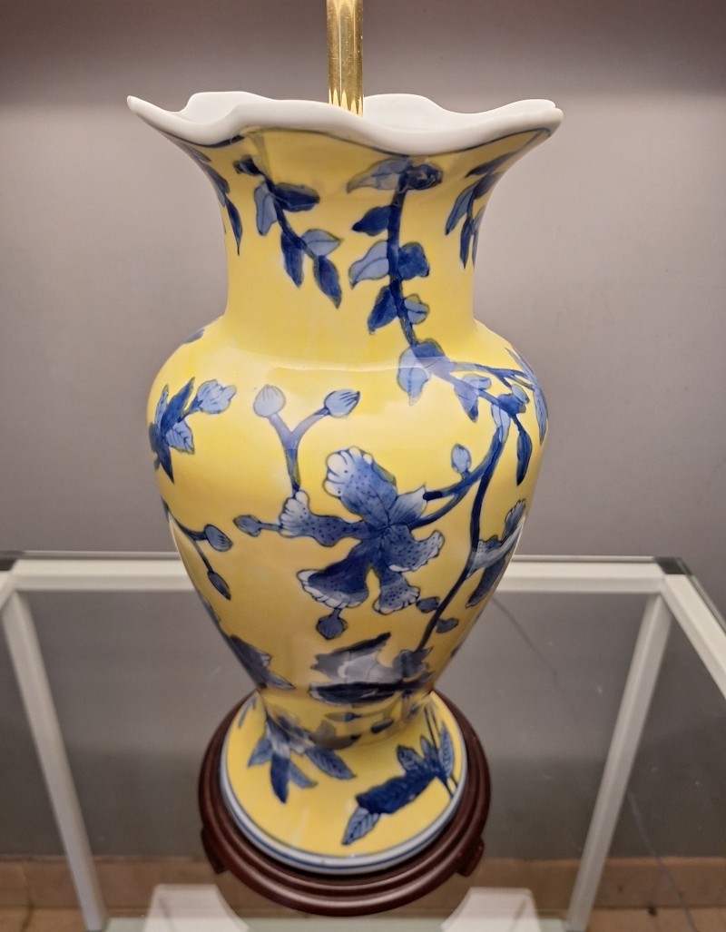 Peça em porcelana pintada à mão, nas cores Amarelo Imperial e Azul, com base original em rosewood.