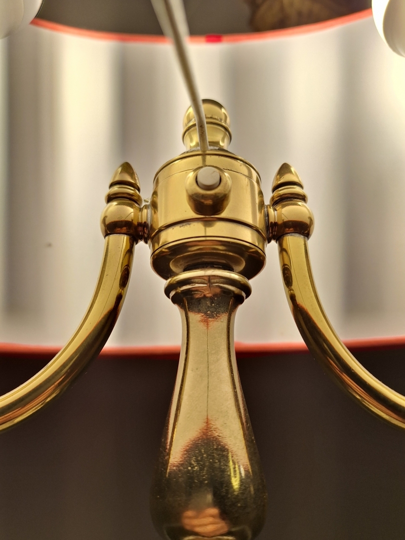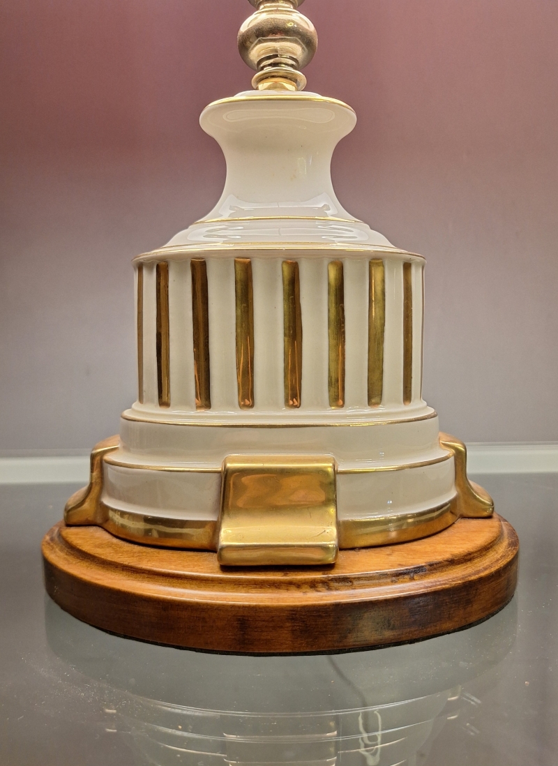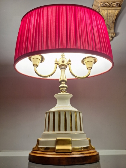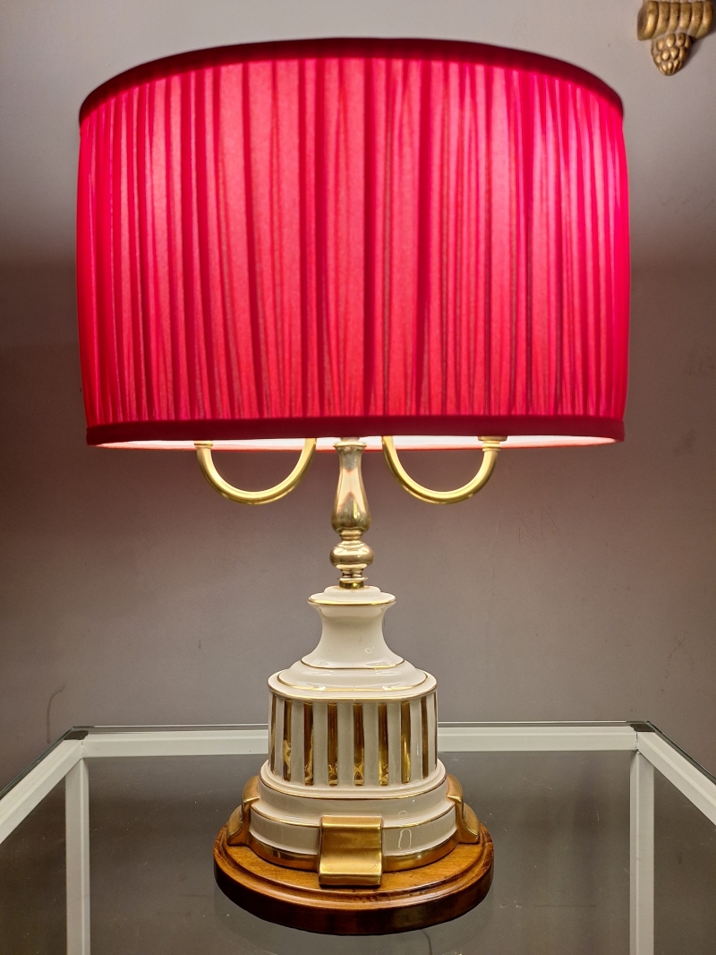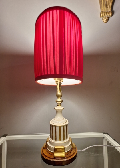 Abajour Francês 1930s/40s; Bouillotte porcelana com acentos dourados, base madeira.