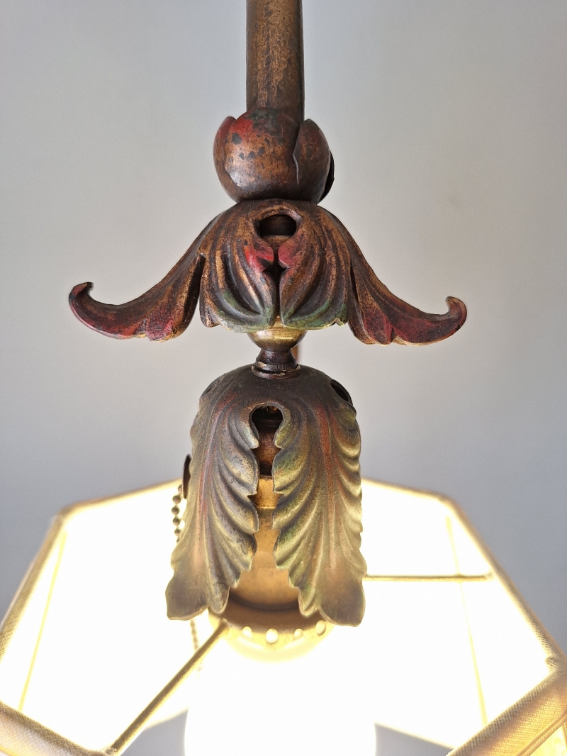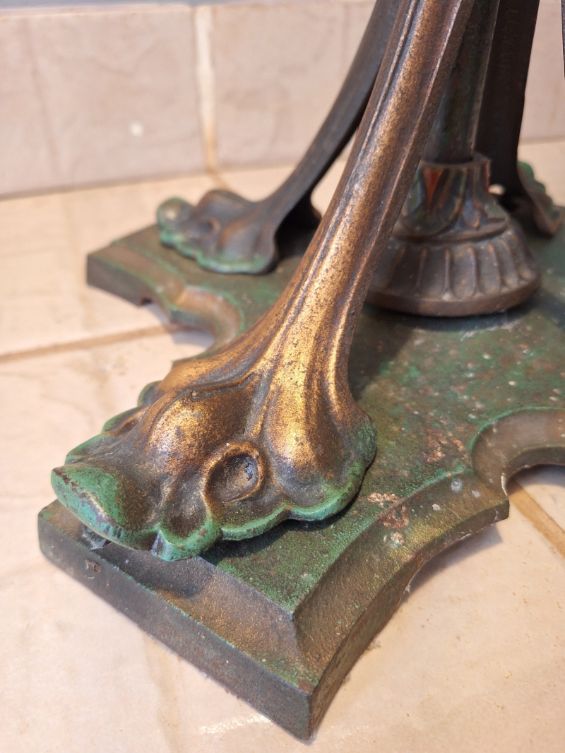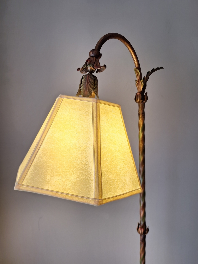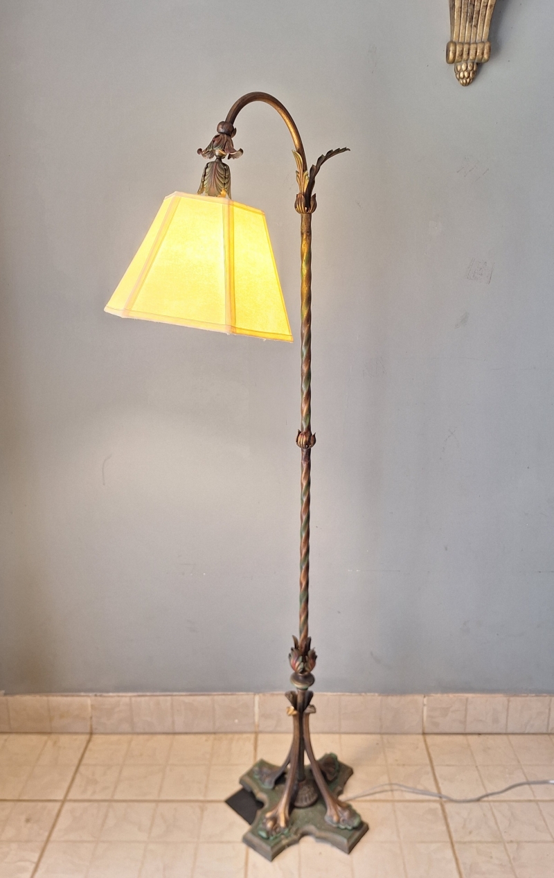 Antique Art Nouveau Cast Iron Floor Lamp (1918), com lindos detalhes em verde, vermelho, e dourado.